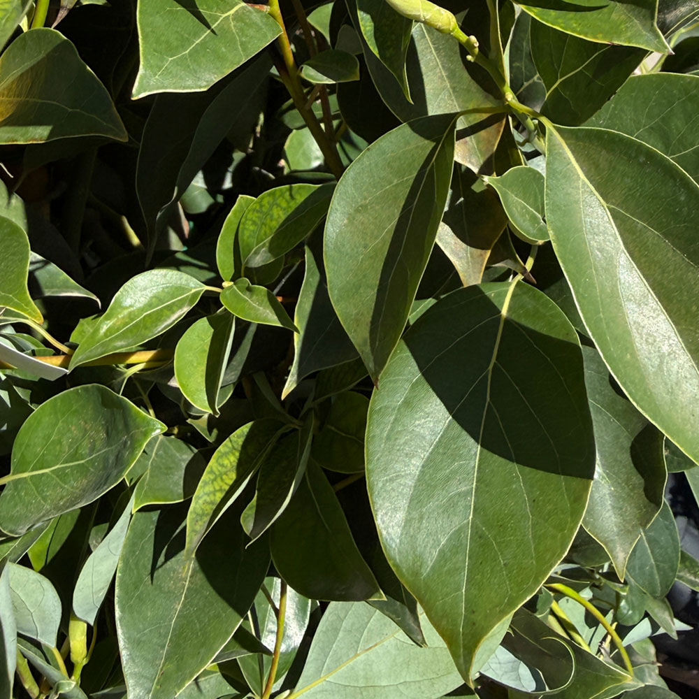 Hojas brillantes, coriáceas, ovaladas, de color verde intenso. Al brotar pueden presentar tonos rojizos. Son aromáticas al estrujarlas, desprendiendo olor a alcanfor.