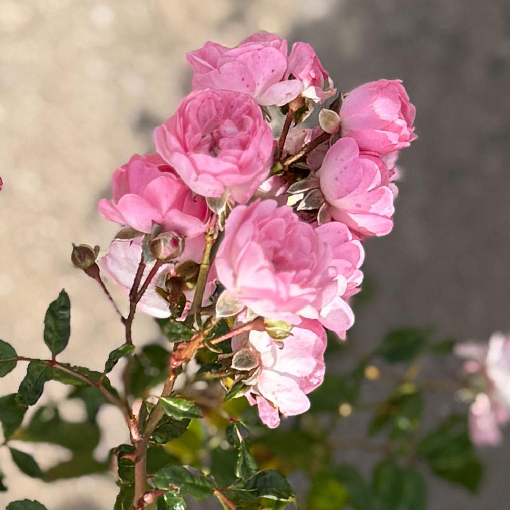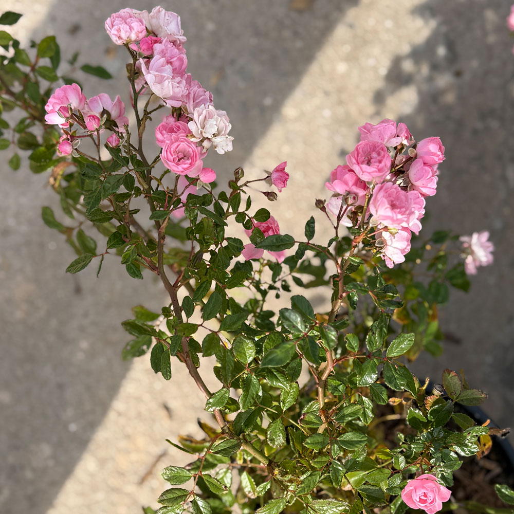 Rosal de tipo tapizante muy apreciado por su impresionante floración en pequeños ramilletes y su efecto alfombra. Aporta un aspecto delicado y romántico, cubriendo el jardín con masas de flores rosadas durante meses.
